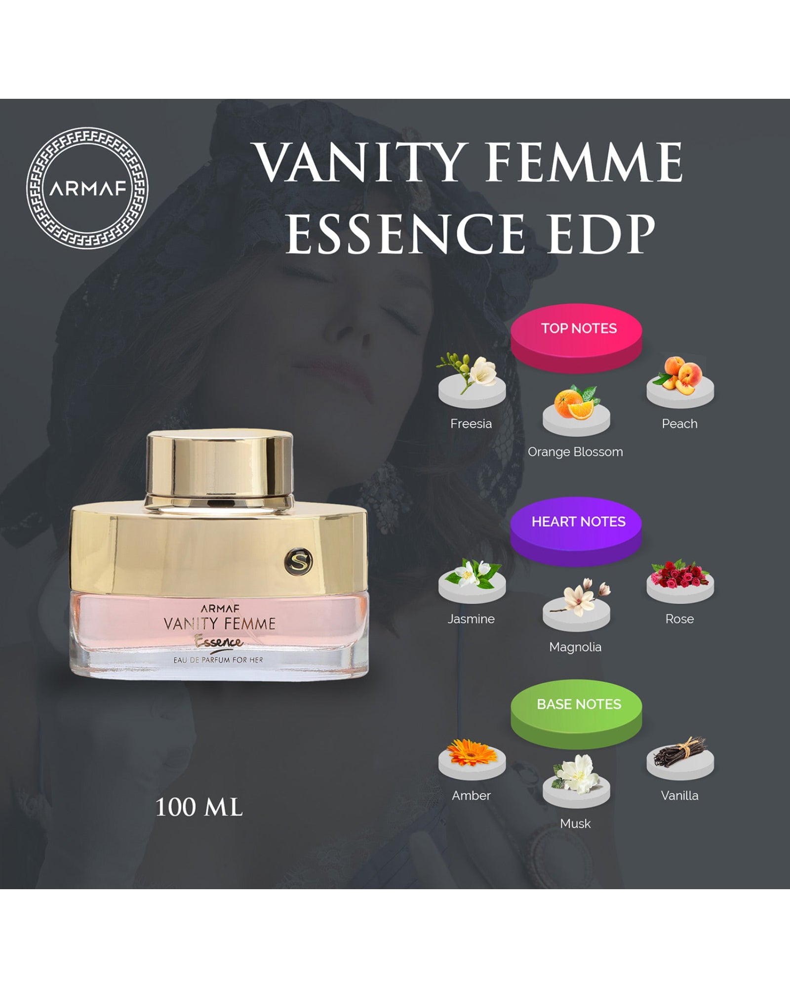 Armaf Vanity Femme is a mesmerizing fragrance of love, romantic and sensual elixir for those who enjoy infatuation and love. Floral top notes open with sensual essences of jasmine, bitter orange wrapped in sweet notes of peach and magnolia blossom. Base consists of soft amber and musky notes intertwined with white flowers.
