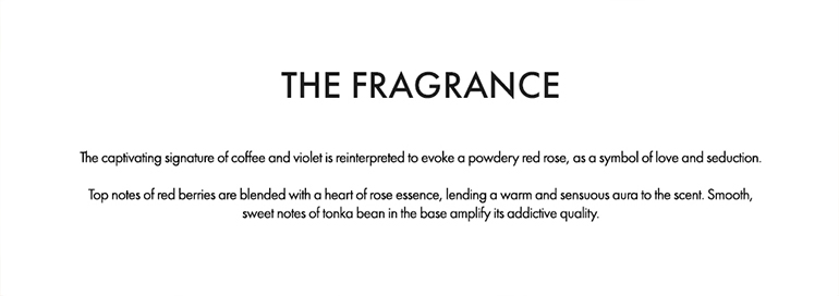 The captivating signature of coffee and violet is reinterpreted to evoke a powdery red rose, as a symbol of love and seduction